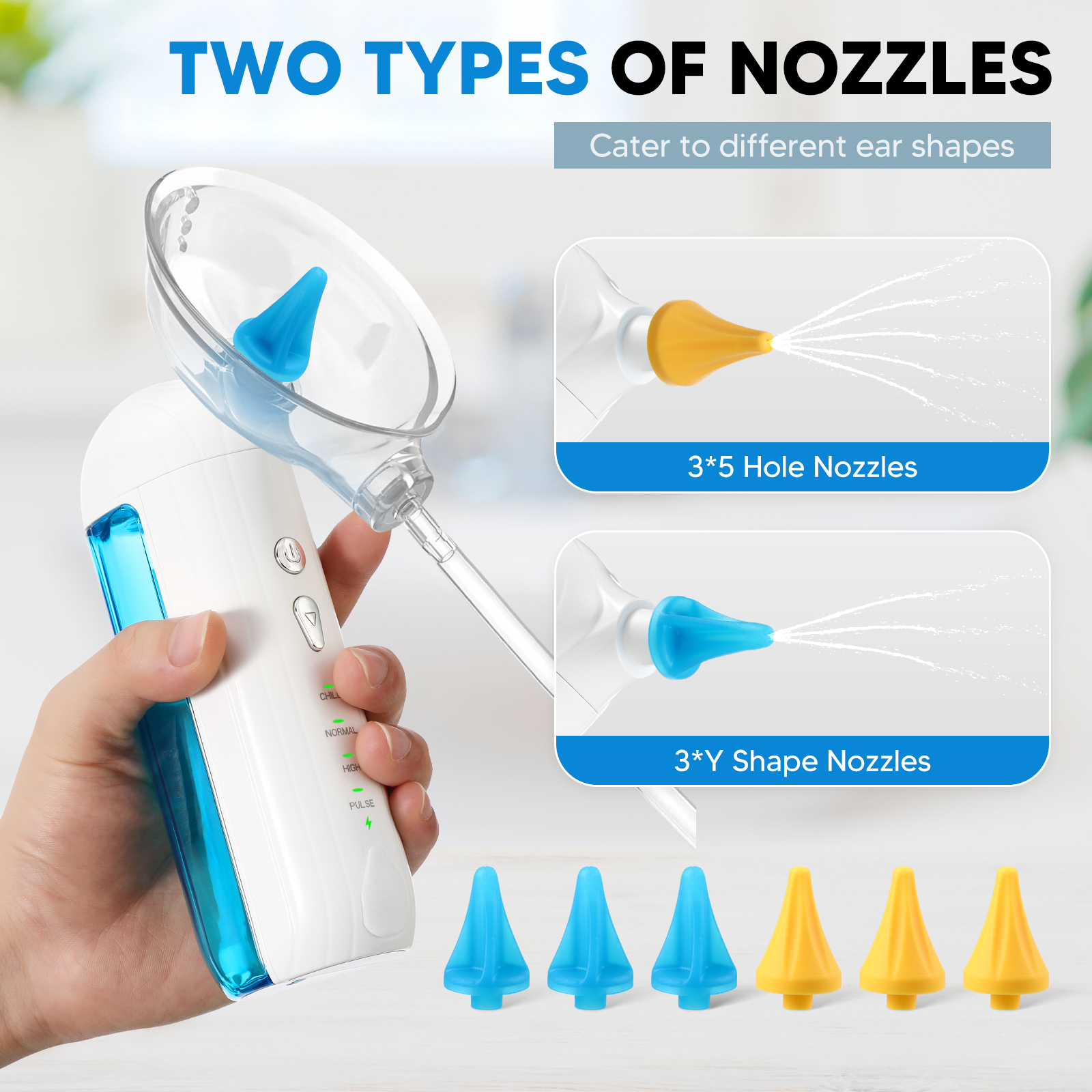 πππ©π₯ππππππ₯π ππ’π₯π’ππ¨π§π ππ¨π³π³π₯π: Electric ear wax removal kit includes three 5-hole and three 3-hole soft silicone nozzle that can be easily replaced to prevent unhealthy ear problems caused by different users. 5-hole nozzle gently rinse the entire ear canal with 5 streams of water, while 3-hole nozzle provide a more concentrated stream of water for deeper ear wax cleaning.