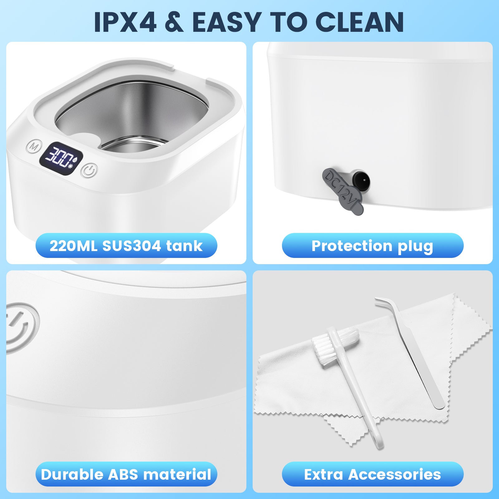 𝐃𝐮𝐫𝐚𝐛𝐥𝐞 & 𝐄𝐚𝐬𝐲 𝐓𝐨 𝐂𝐥𝐞𝐚𝐧: This ultrasonic cleaner retainer is IPX4 rated to reliably protect against splashes and spills. The exterior of this ultrasonic cleaner is made from ABS material and the interior is made from 304 stainless steel 220ml water tank. This design ensures long-lasting and easy cleaning, making the ultrasonic cleaner a great gift for teenagers, adults and elderly people.