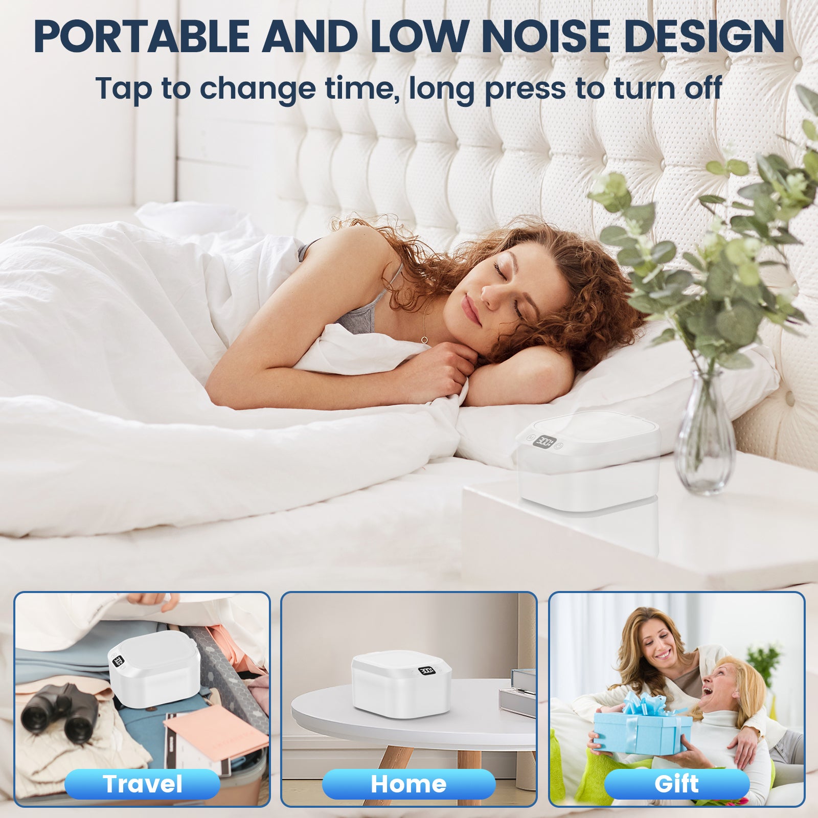 𝐏𝐨𝐫𝐭𝐚𝐛𝐥𝐞 & 𝐂𝐨𝐦𝐩𝐚𝐜𝐭 𝐃𝐞𝐬𝐢𝐠𝐧:DeeWaves compact denture ultrasonic cleaner fits on a table by the sink without taking up too much space. It measures 5.2 x 4.4 x 2.6 inches, has a capacity of 220 ml and weighs just 1.2 pounds. It's easy to take with you wherever you go. When travelling, you can keep the ultrasonic cleaner in your suitcase.